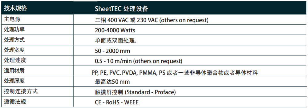 SheetTEC平板/片材表面處理設備采用金屬電極方式可以最優化的處理非導體材料,同時陶瓷電極可以作為選擇項來處理像鋁合金、不銹鋼材質的導體材料。