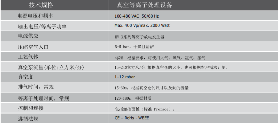 ·安裝及使用簡單 ·處理速度快 ·標(biāo)準(zhǔn)或客制化的處理倉 ·真空度 ·工藝氣體 ·進(jìn)程控制 ·節(jié)約成本 ·真空壓力下等離子處理 ·獨(dú)特設(shè)計的倉門 |